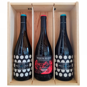 Caja madera 3 botellas en acabado natural con tapa corredera.