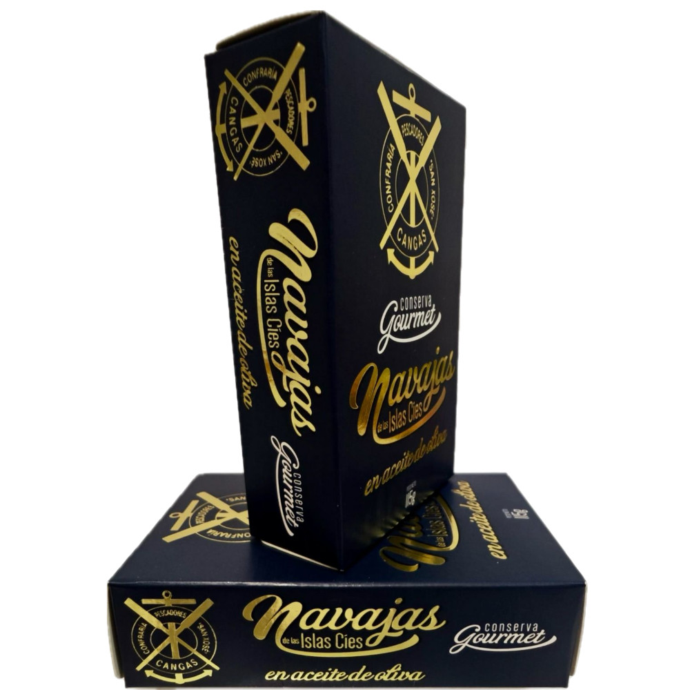 Navajas en aceite de oliva A Conserveira , una exquisitez de la conservera. Es un deleite culinario procedente de las famosas Rías Gallegas.