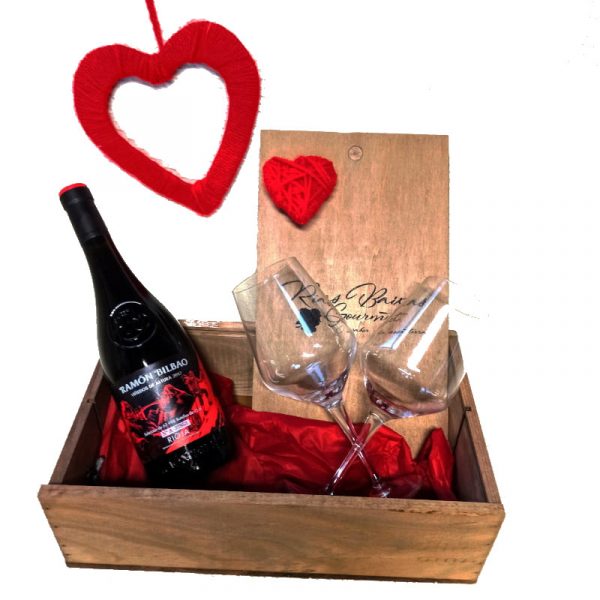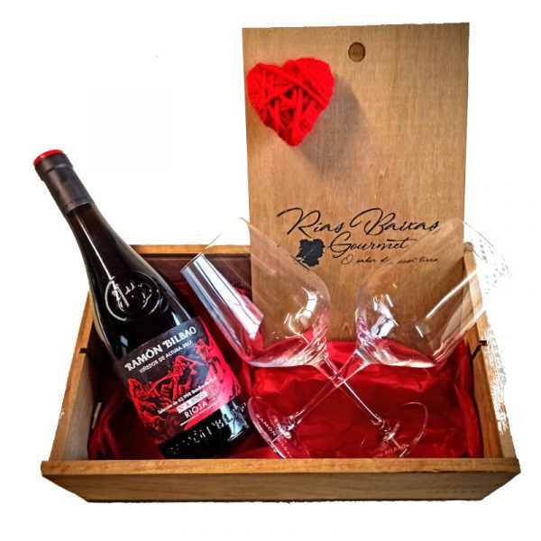 Caja San Valentin Ramón Bilbao Viñedos de Altura con dos copas, perfecta para disfrutar con tu pareja. La caja de madera cuenta con tapa corredera y está serigrafiada con el logo de Rías Baixas Gourmet.