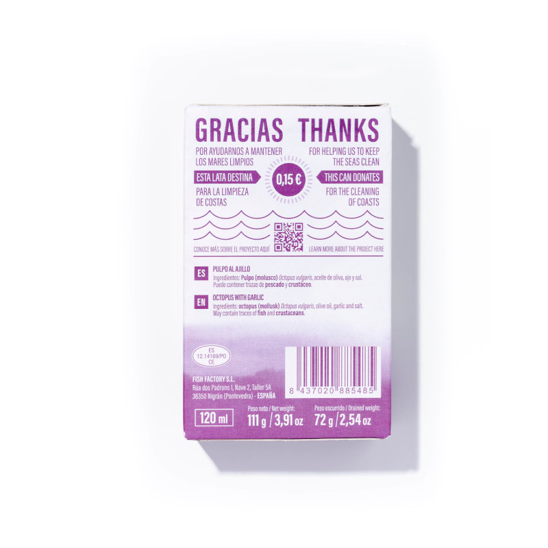 El proceso de elaboración es manual, pulpo tiernamente cocido y marinado en una exquisita mezcla de aceite de oliva virgen extra, ajo y sal marina.
